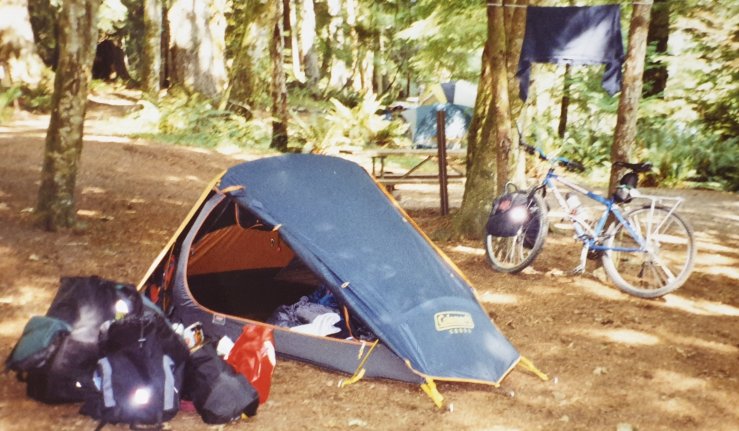 They packed up and went home the next day and me and my bicycle spent our first night alone in the forest with all the noises, the bears and cougars. I had to put all my food in the car of the couple camping next to me, so my tent wasn’t ravaged by hungry beasts.
