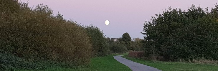 Getting out of the traffic, onto a bike path or through the park. Into the trees, under the sky. I notice the birds and the brook. Bid good morning and wave to everybody. I smile at unruly puppies that come lolloping into my path. I feel the wind and notice the temperature. I see the sun and moon rise. I see the sun and moon set. Rain is never as bad as it sounds from inside the house.
