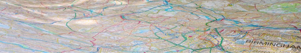 My hand smooths the paper. Land falling away to the river plain in the North East. Rivers Tame, Rea, Cole and Blythe sucking water from across the Birmingham Plateau. Onward through the urban sprawl to the confluence at Blythe End where the Tame continues alone, flowing off the Northern edge of the map.